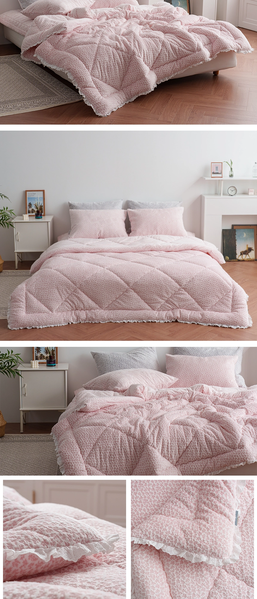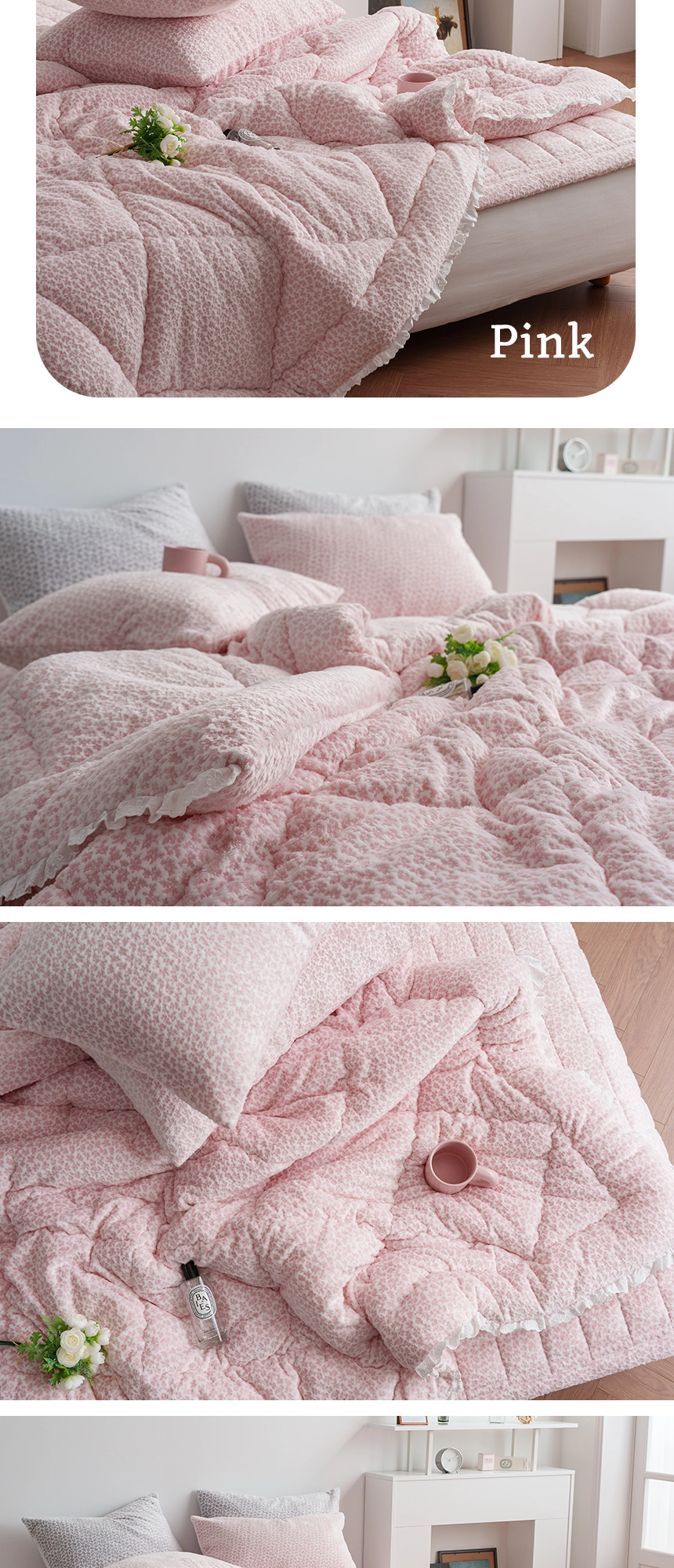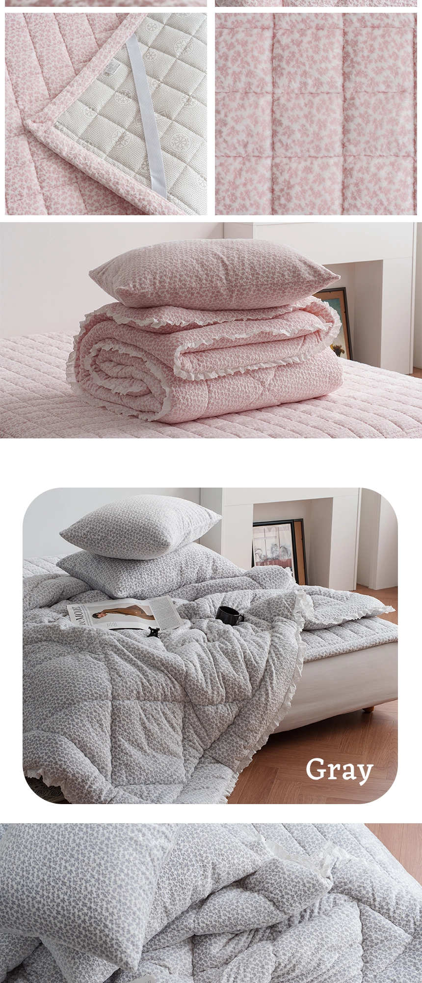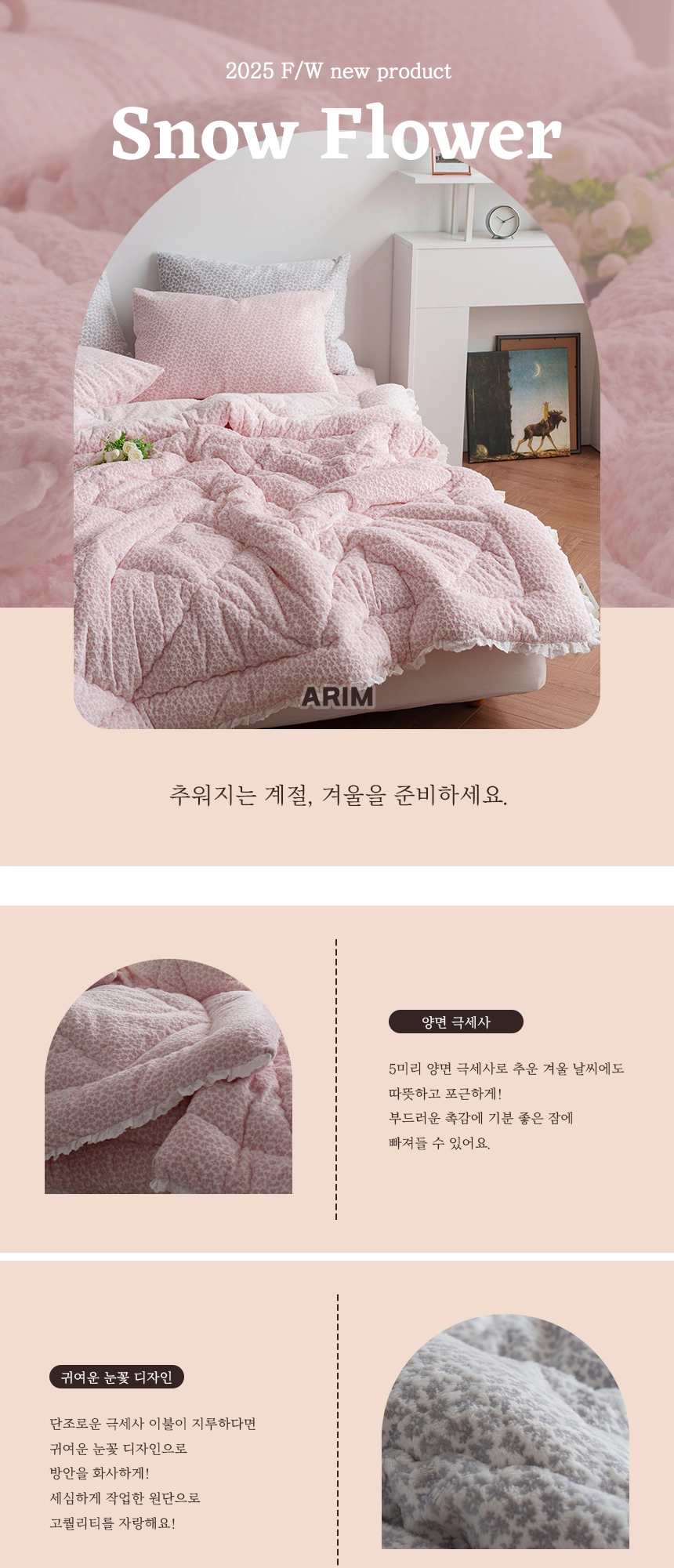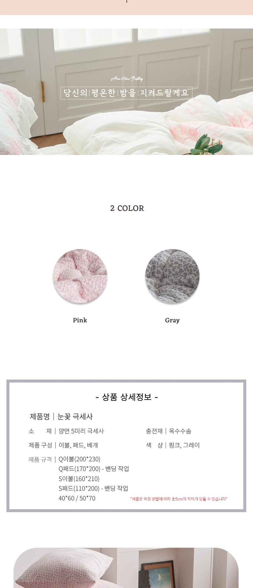 제품명 : 눈꽃 극세사 소재 : 양면 5미리 극세사 충전재 : 옥수수솜 색상 : 핑크, 그레이 사이즈 Q이불(200*230) Q패드(170*200) – 밴딩 작업 S이불(160*210) S패드(110*200) – 밴딩 작업 40*60 / 50*70