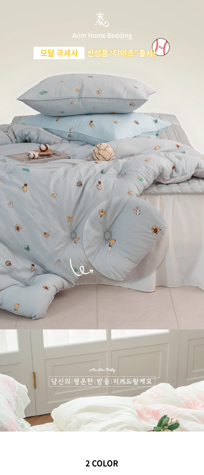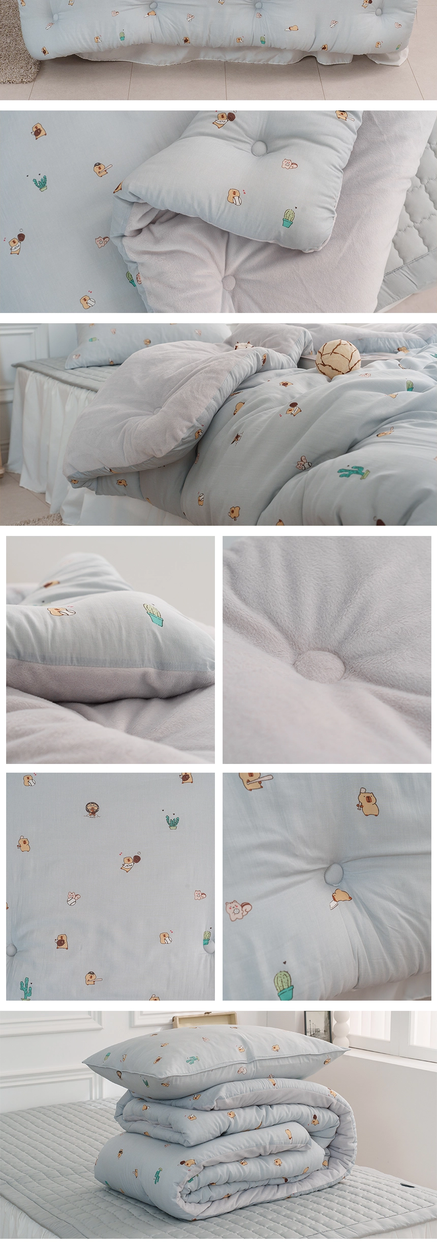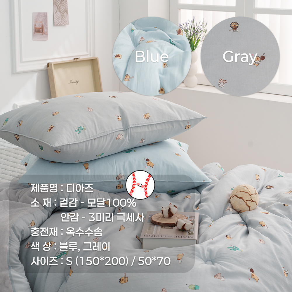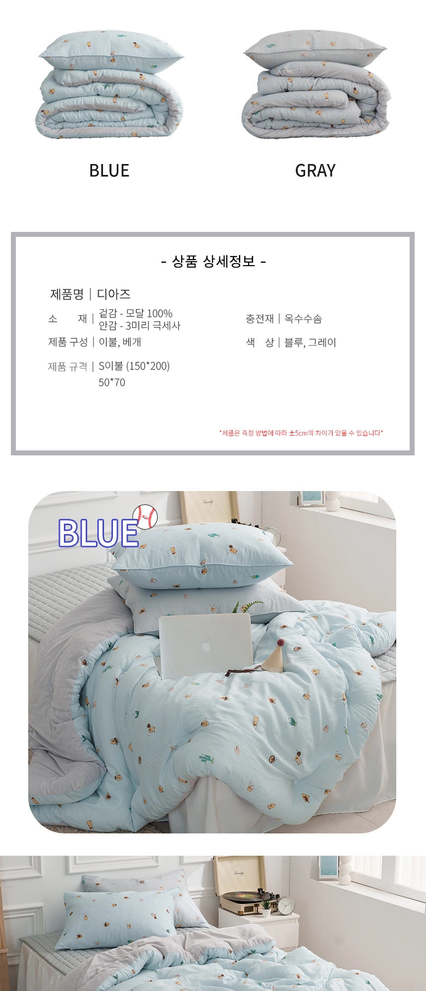 제품명 : 디아즈 소재 : 겉감 – 모달 100% 안감 – 3미리 극세사 충전재 : 옥수수솜 색상 : 블루, 그레이 사이즈 S이불 (150*200) 50*70