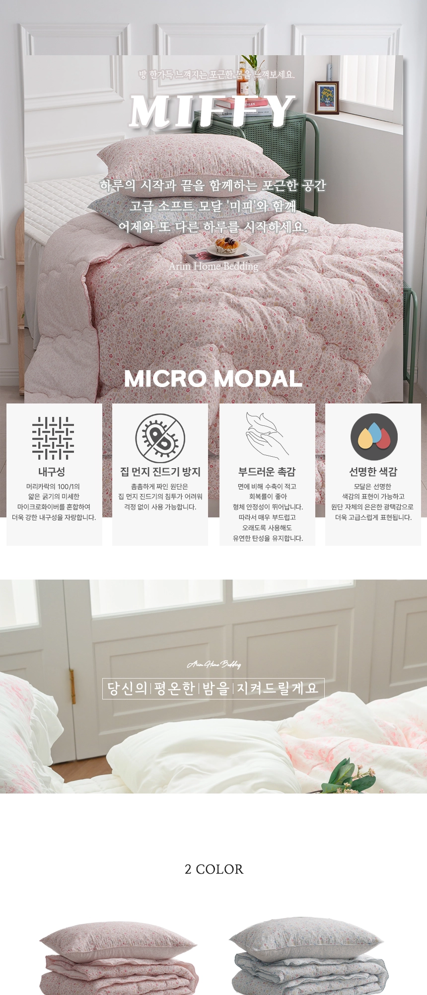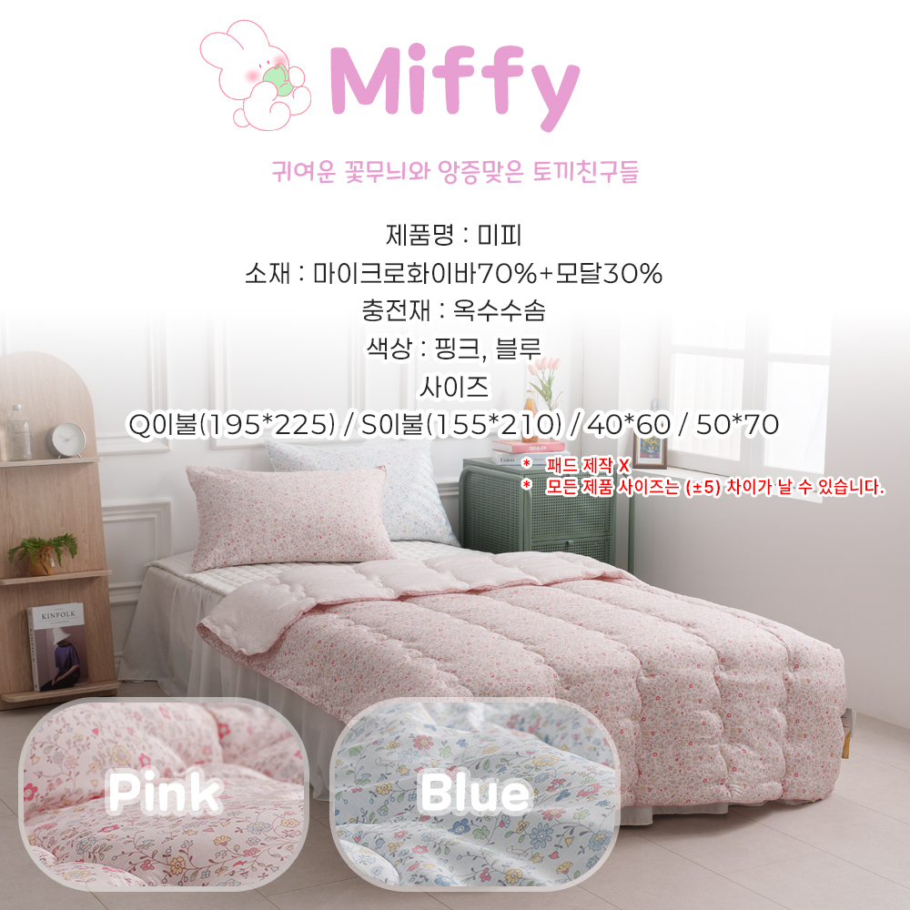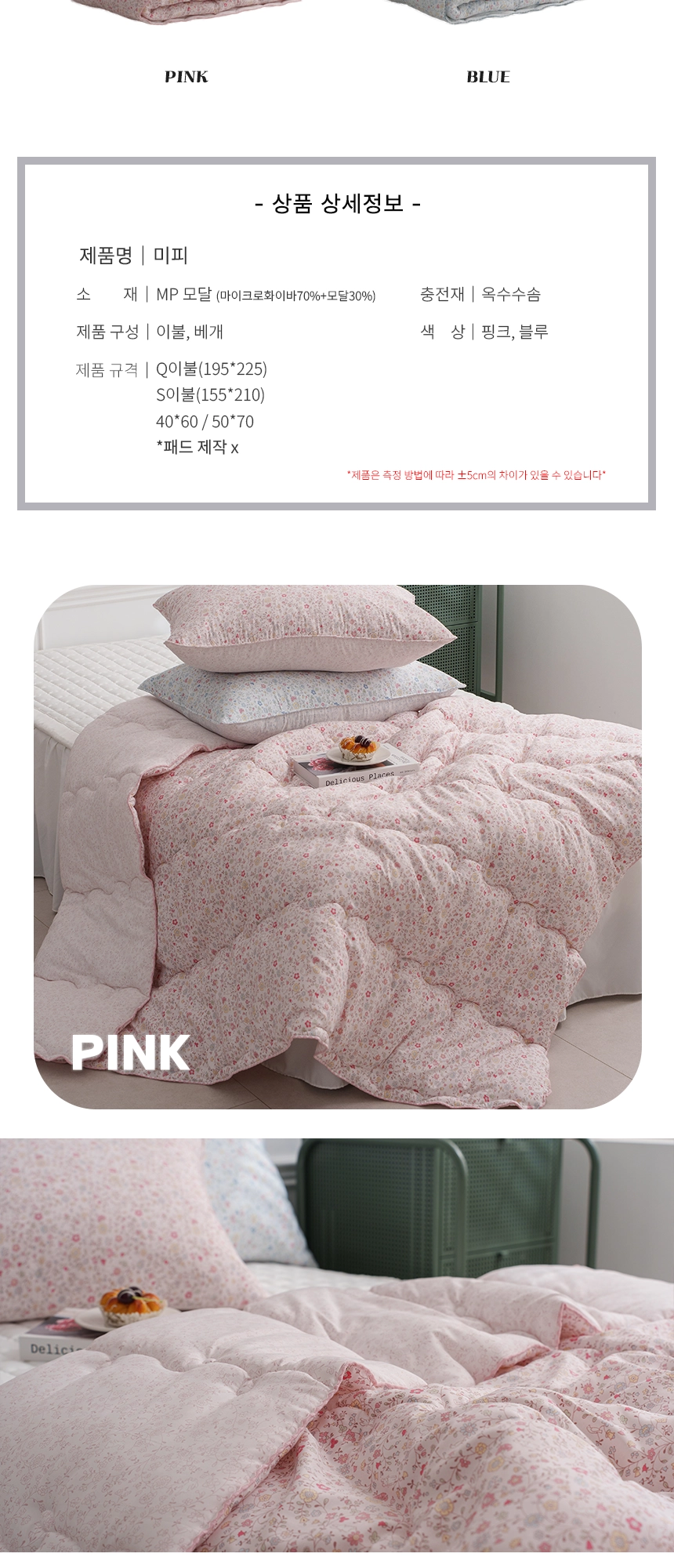 제품명 : 미피 소재 : MP모달 (마이크로화이바70%+모달30%) 충전재 : 옥수수솜 색상 : 핑크, 블루 사이즈 Q이불(195*225) S이불(155*210) 40*60 / 50*70 패드 제작 x