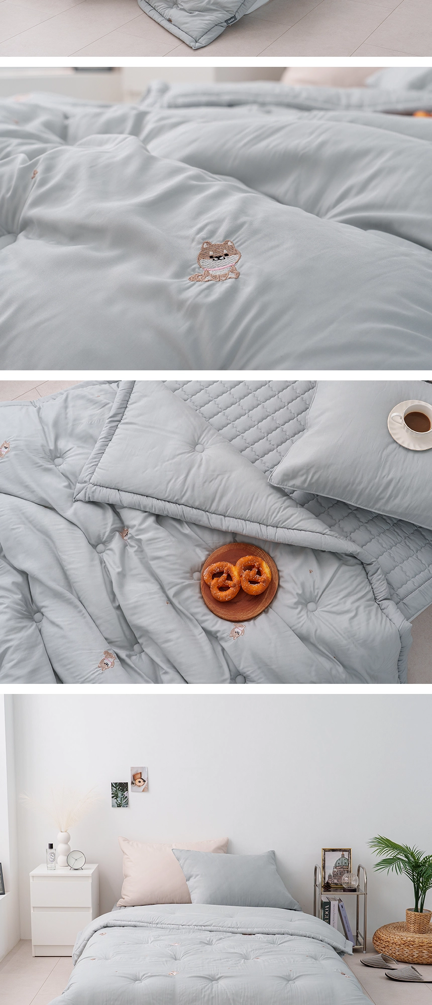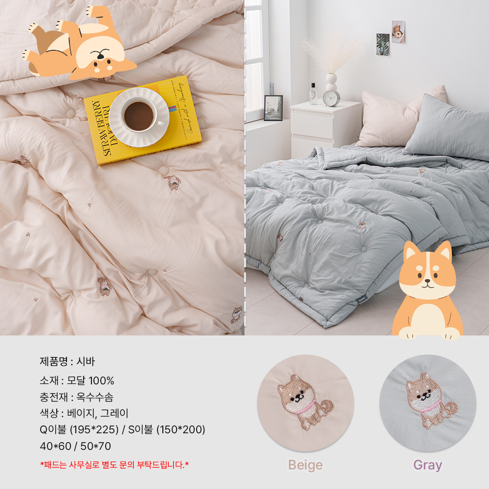 제품명 : 시바 소재 : 모달 100% 충전재 : 옥수수솜 색상 : 베이지, 그레이 사이즈 Q이불 (195*225) S이불 (150*200) 40*60 / 50*70