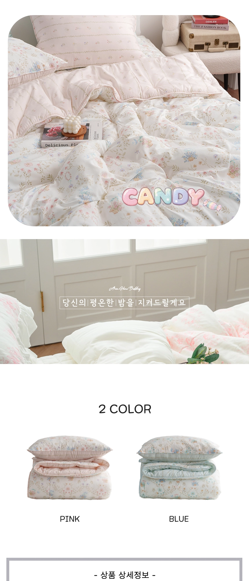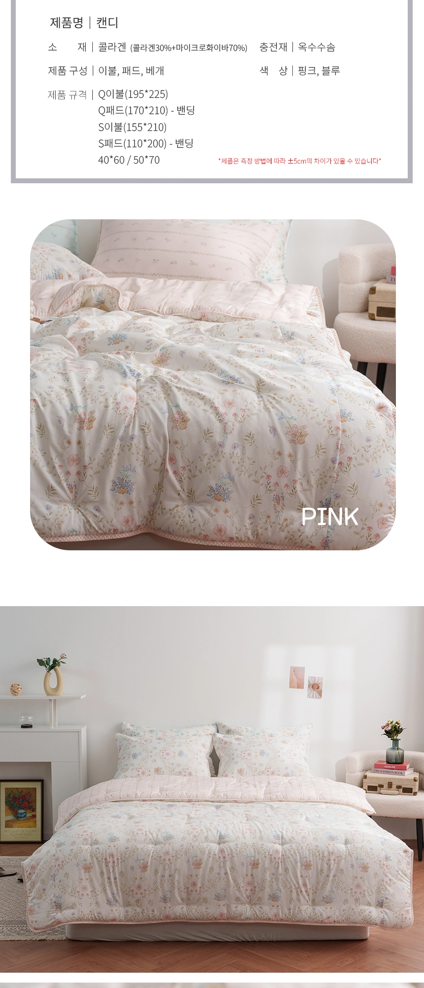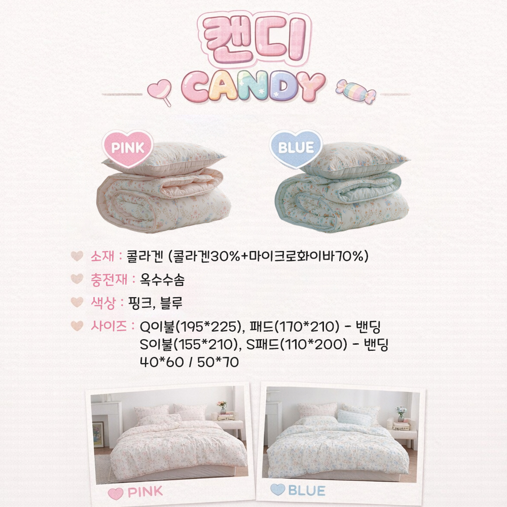 제품명 : 캔디 소재 : 콜라겐 (콜라겐30%+마이크로화이바70%) 충전재 : 옥수수솜 색상 : 핑크, 블루 사이즈 Q이불(195*225) Q패드(170*210) – 밴딩 S이불(155*210) S패드(110*200) – 밴딩 40*60 / 50*70